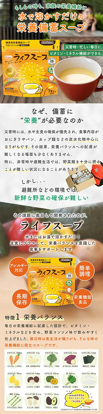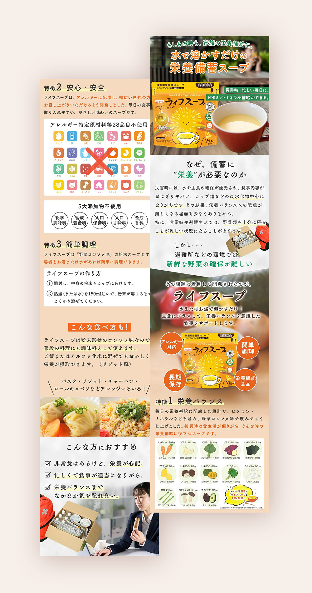「備蓄用栄養食品」と「日常の栄養サポート」という2つの価値が伝わるよう、課題提起から商品提案へとつなげる構成で設計。魅力は3つに整理し、直感的に理解できるよう工夫しました。 また、調理例を掲載することで、非常時だけでなく日常にも取り入れやすい商品であることを訴求しています。