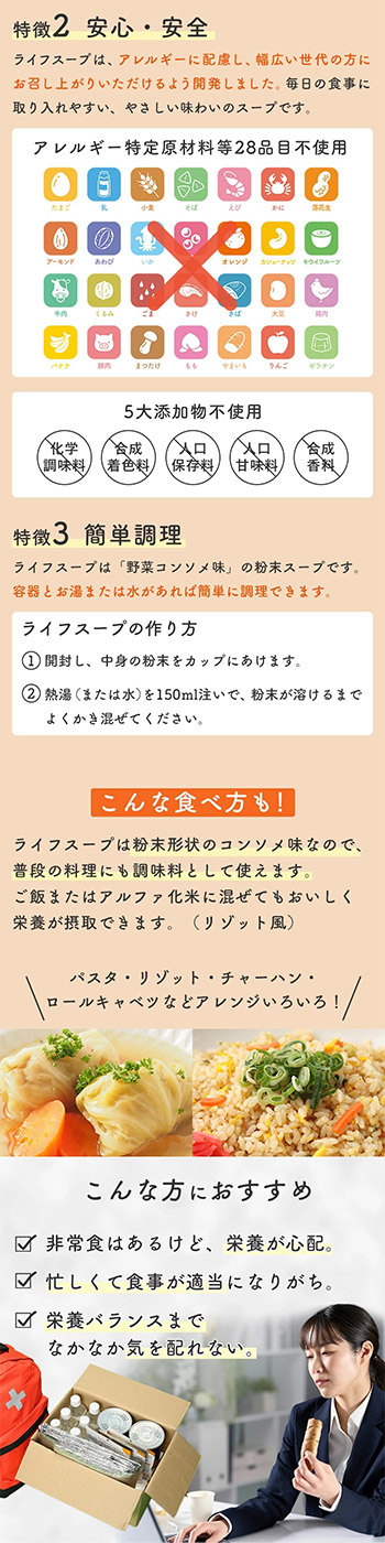 備蓄食品を探している方。非常食の栄養面に不安がある方。忙しく、日々の栄養バランスに気を配れない層。